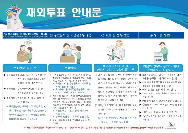 제21대 국회의원 재외선거 투표장소 및 기간, 준비물 등을 공지 드립니다. 신고·신청에 참여하신 재외국민들께서는 첨부된 “재외투표안내문”을 확인·숙지하시어 투표참여에 참고하시기 바랍니다.