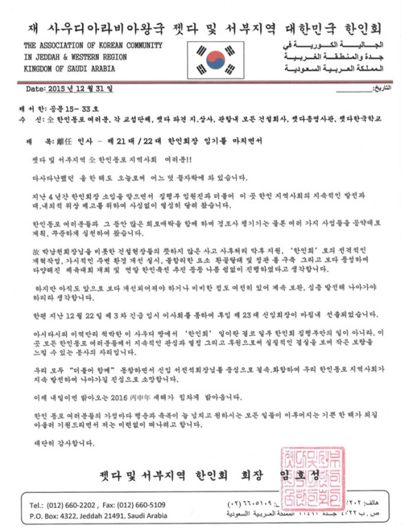 제22대 한인회장 임호성 "이임인사" 페이지 정보 작성자 click758 작성일16-01-03 22:37 조회16,194회 댓글0건 이전글 다음글 목록 본문 한인회 홈페이지 http://jeddah.korean.net/ 댓글목록 등록된 댓글이 없습니다. 이전글 다음글 목록