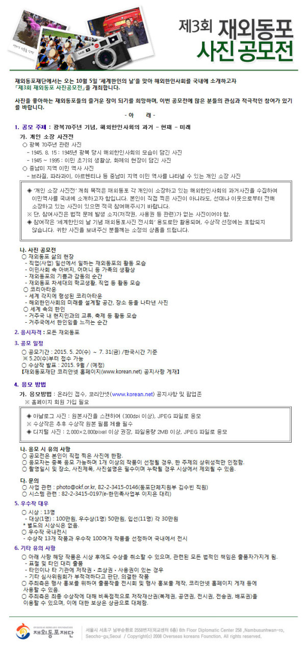[재외동포재단] 제 3회 재외동포 사진전 안내입니다 페이지 정보 작성자 click758 작성일15-06-10 02:09 조회18,455회 댓글0건 이전글 다음글 목록 본문 한인회 홈페이지 http://jeddah.korean.net/ 댓글목록 등록된 댓글이 없습니다. 이전글 다음글 목록