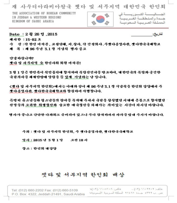 96주년 3일절 행사 공지 페이지 정보 작성자 click758 작성일15-03-04 14:52 조회19,373회 댓글0건 이전글 다음글 목록 본문 한인회 배상 한인회 홈페이지 http://jeddah.korean.net/ 댓글목록 등록된 댓글이 없습니다. 이전글 다음글 목록