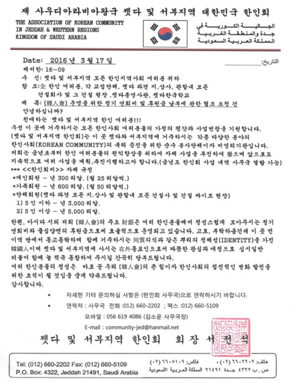 한인회비 및 후원금 납부에 관한 협조 요청 페이지 정보 작성자 click758 작성일16-03-19 00:06 조회15,646회 댓글0건 이전글 다음글 목록 본문 http://jeddah.korean.net 댓글목록 등록된 댓글이 없습니다. 이전글 다음글 목록
