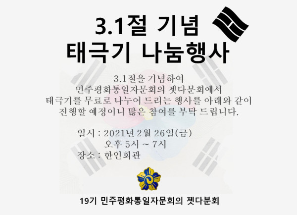 t삼일절 행사 취소 안내~ 페이지 정보 작성자 강아지 작성일21-02-23 04:46 조회13,182회 댓글0건 이전글 다음글 목록 본문 한인회 사무국에서 안내의 말씀을 드립니다. 금번 102주년 삼일절 기념행사는 코로나 상황으로 인해 취소되었음을 알려 드리며 민주평통자문회의 젯다분회에서 삼일절을 기념하여 태극기(게양국기) 나눔행사를 진행한다고 하니 위 안내문을 참고하시어 많은 참여 부탁드리겠습니다. 감사합니다. 댓글목록 등록된 댓글이 없습니다. 이전글 다음글 목록