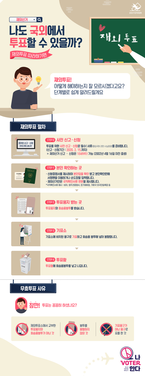 제21대 국회의원 재외선거 페이지 정보 작성자 강아지 작성일20-03-20 19:20 조회21,987회 댓글0건 이전글 다음글 목록 본문 안녕하세요? 중앙선관위 홍보과 윤경하 주무관입니다. 2020년 실시하는 제21대 국회의원 재외선거와 관련하여 재외선거 투표절차 인포그래픽(5회차)을 보내드립니다. 신분증을 통한 본인확인 절차와 유의사항을 설명하는 자료입니다. 많은 활용 부탁드립니다. 감사드립니다. 윤경하 드림 댓글목록 등록된 댓글이 없습니다. 이전글 다음글 목록