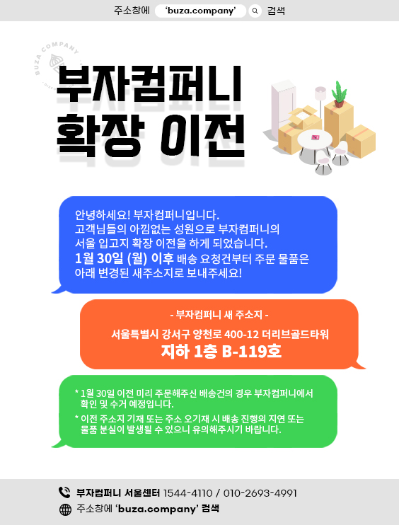 부자컴퍼니 DELIVERY (부자택배) 확장 이전 공지 페이지 정보 작성자 피노키오 작성일23-01-25 16:40 조회5,586회 댓글0건 이전글 다음글 목록 본문 홈페이지 : https://buza.company카카오톡 : https://pf.kakao.com/_NnMSK 댓글목록 등록된 댓글이 없습니다. 이전글 다음글 목록