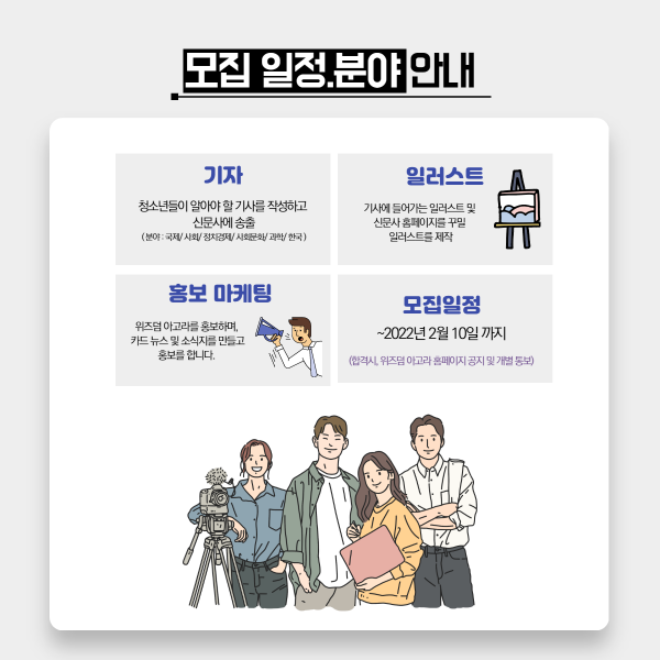 - 해외 거주 중인 한인 고등학생 (기자 및 홍보팀은 2008년생 이상, 일러스트는 2009년 중학생부터 가능합니다. )