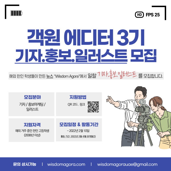 Wisdom Agora는 해외에서 국제 학교를 졸업하고 대학생이 된 학생들이 만든 온라인 신문사로 해외 한인 학생들이 만든 기사, 일러스트, 미디어를 통해 함께 생각을 나누고자 만든 공간입니다. 국제적인 네트워킹과 시각의 다양성을 위해 각국을 대표할 객원 에디터를 모집합니다.